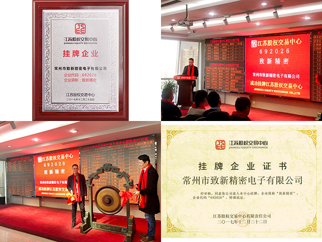2018年1月11日下午,江蘇股權(quán)交易中心企業(yè)集中掛牌儀式隆重舉行。本次掛牌的共有38家企業(yè),其中常州市致新精密電子有限公司(以下簡(jiǎn)稱“致新精密”)成功掛牌成長(zhǎng)板。掛牌儀式的成功舉行,要感謝江蘇股權(quán)交易中心對(duì)我司各方面實(shí)力的審計(jì)與認(rèn)可。